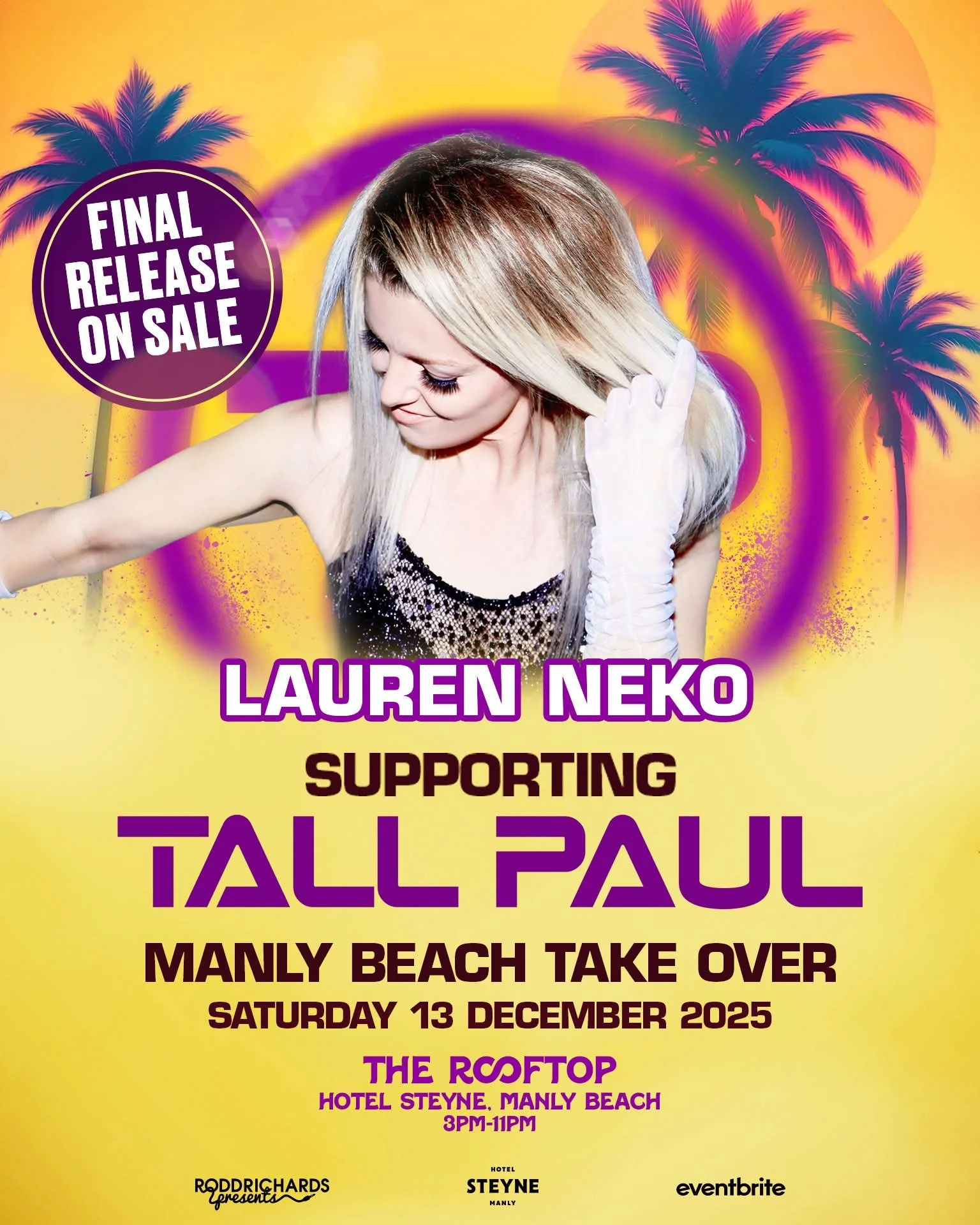 Lauren Neko has shared lineups with some of the most respected artists in House music, including Purple Disco Machine, Sonny Fodera, Horse Meat Disco, David Penn, Mousse T, Shapeshifters, Chicane, and Claptone. Her mainstage energy has seen her headline and close events and festivals such as Ultra Violet (Mardi Gras), Hed Kandi (Ibiza), Poof Doof, Cloud 9 (Fiji), and Karma Beach Club (Bali). She has featured on releases with international artists including Nicky Romero and Roni Size, and has played and released through iconic club brands such as Ministry of Sound, Glitterbox, Hed Kandi, Kinky Malinki, and Soul Heaven.